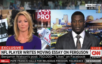 Benjamin Watson, jugador estrella de los New Orleans Saints en la NFL (Liga de Fútbol Americano Nacional), concedió el 28 de noviembre, a través de un enlace, una entrevista en vivo a la conductora Brooke Baldwin en CNN sobre los disturbios en Ferguson y una publicación que hizo en su página de Facebook sobre el tema del racismo.
