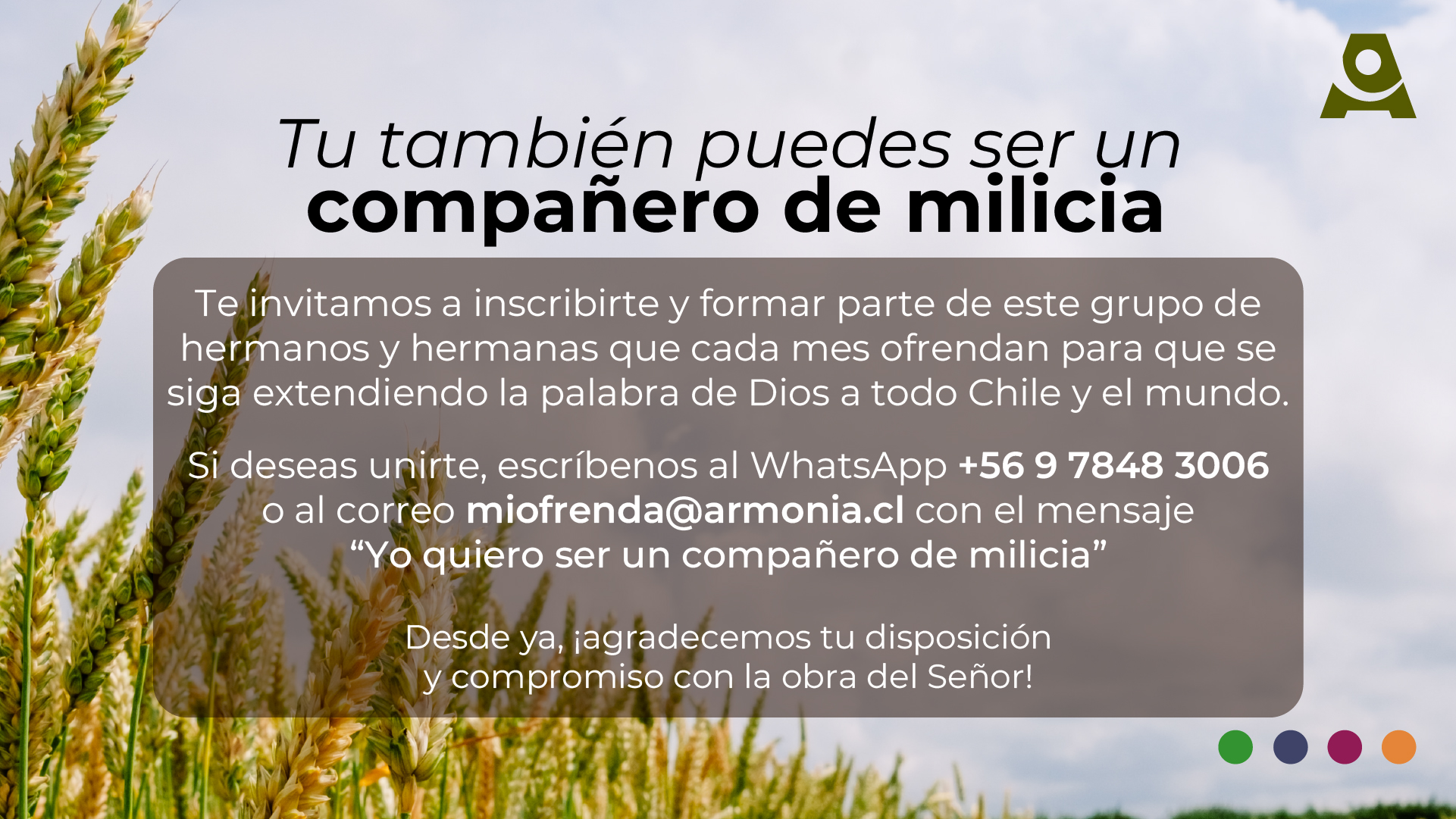 Los compañeros de milicia son claves en el funcionamiento de Armonía, pues son instrumentos de Dios para financiar el trabajo que se realiza a lo largo de todo Chile para llevar una señal que traiga esperanza a los corazones, con el mensaje de la palabra de Dios.