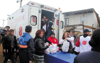 En entrevista con el Mayor Hernán Espinoza, Comandante Divisional del Ejército de Salvación, nos informó que a las pocas horas de producido el terremoto ellos comenzaron a trabajar con la gente que tuvo que dormir en la pampa, donde no tenían protección ni alimentación, como en los albergues.